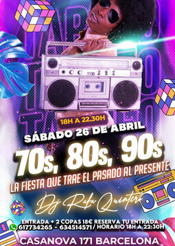Los clásicos de siempre 70s, 80s, 90s suenan ahora más fuerte que nunca en nuestros Tardeos, los originales del sábado tarde en Barcelona. Dance, Pop Internacional, Nacional y la más divertida música de fiesta en versiones originales, y como siempre el mejor ambiente de la ciudad condal. ¡¡Además llévate nuestra exclusiva pulsera!!