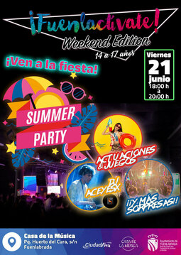 Quiero rayos de sol, tumbados en la arena... Que sí, que sí, que por fin ha llegado el veranito y han terminado las clases. ¡Esto hay que celebrarlo! ¡Pues te proponemos un planazo! No te puedes perder la fiesta Fuenlactívate Summer, donde podrás bailar al ritmo de la música de nuestro DJ Aceyesx, disfrutar de nuestras actuaciones, concursos y juegos.