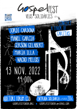L'import de les entrades va íntegre i directament al projecte de Caritas. Pots incrementar la teva aportació fent un donatiu mitjançant: -BIZUM: 33381 -Ingrés al compte: IBAN ES85 2100 0965 5002 0011 0175 Concepte: Gospelfest |