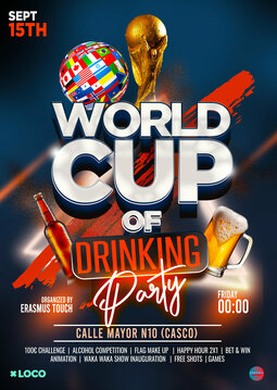 The Erasmus party, known as the "World Cup Party," promises an electrifying experience. Get ready for an alcohol competition on stage, a captivating opening show called the "Waka Waka Show," and a shot-betting system to add some thrill to your night. There'll be lively entertainment, flag-themed face painting at the entrance, and a daring challenge where you could win €100 by cutting your hair, eyebrow, or getting a tattoo.